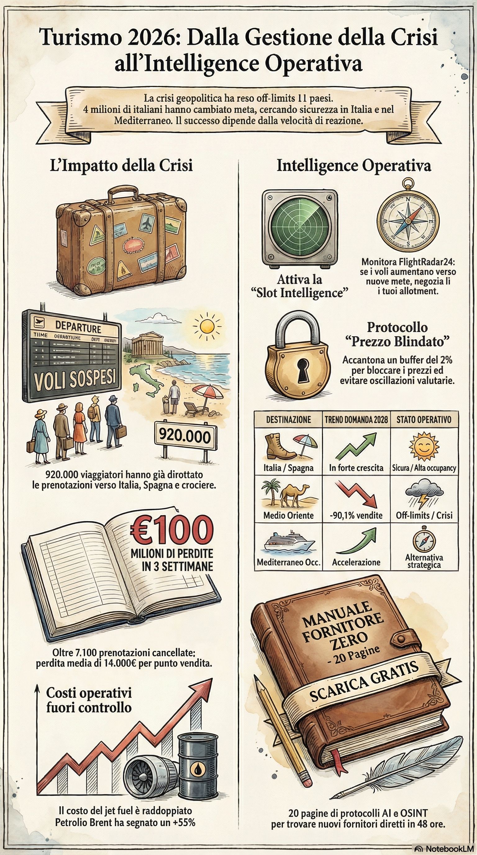 → Il Mindset dell'Intelligence (pag. 1-3). Perché i metodi tradizionali — fiere, cataloghi, telefonate ai soliti — falliscono in emergenza. Come identificare i vuoti di mercato creati dalla crisi usando i dati macro del turismo organizzato per giustificare la riallocazione di budget davanti al cliente e ai fornitori, trasformando il problema in una conversazione di upgrade.